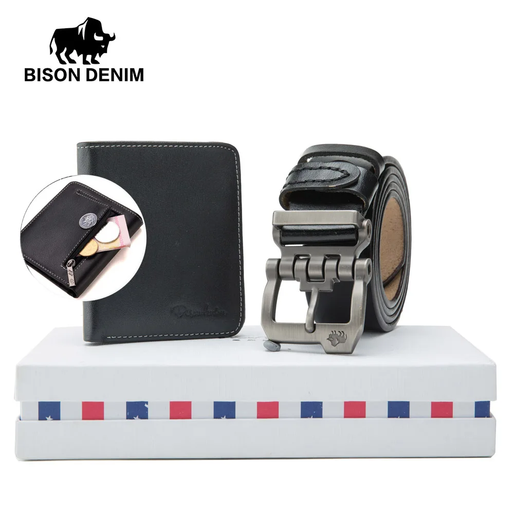 Good Price BISON DENIM Men Belt & Wallet Genuine Leather Set with Box Pin Buckle Male Belt Fashion Wallet for